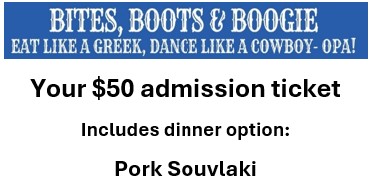 Your $50 admission ticket includes:Â Pork Souvlaki. Served with a side of imported Greek Gigantes Beans baked in a rich tomato sauce, Greek Style Coleslaw and Lemon Roasted Potatoes. Choice of Baklava Sundae or Apple Cobbler Ala Mode for dessert.