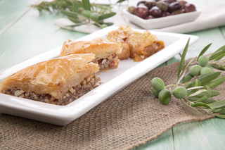 Delicate layers of buttered filo pastry, spices, and chopped walnuts, drizzled with honey syrup.